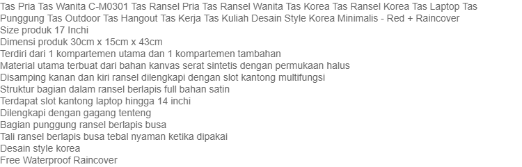 Tas Pria Tas Wanita C-M0301 Tas Ransel Pria Tas Ransel Wanita Tas Korea Tas Ransel Korea Tas Laptop Tas Punggung Tas Outdoor Tas Hangout Tas Kerja Tas Kuliah Desain Style Korea Minimalis - Red + Raincover