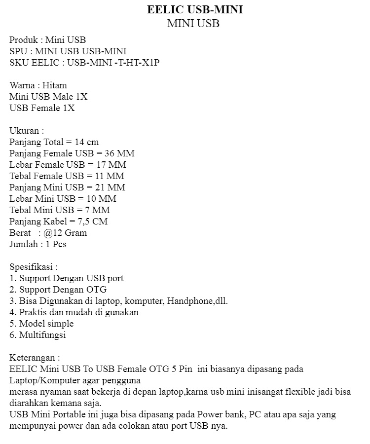 EELIC USB-MINI HITAM ISI 1 PCS MINI USB TO USB FEMALE OTG 5 PIN TO USB FEMALE MULTIFUNGSI BERKUALITAS TINGGI