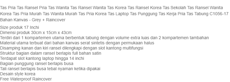 Tas Pria Tas Ransel Pria Tas Wanita Tas Ransel Wanita Tas Korea Tas Ransel Korea Tas Sekolah Tas Ransel Wanita Korea Tas Pria Murah Tas Wanita Murah Tas Pria Korea Tas Laptop Tas Punggung Tas Kerja Pria Tas Tabung C1056-17 Bahan Kanvas - Grey + Raincover
