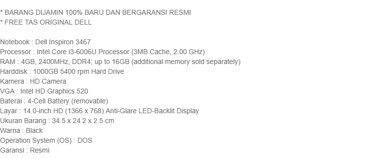 Dell Inspiron 3467 Core i3-6006/RAM 4GB/HDD 1TB/GARANSI RESMI-Hitam