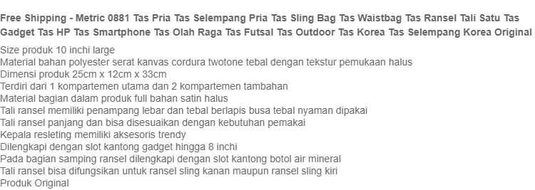 Free Shipping - Metric 0881 Tas Pria Tas Selempang Pria Tas Sling Bag Tas Waistbag Tas Ransel Tali Satu Tas Gadget Tas HP Tas Smartphone Tas Olah Raga Tas Futsal Tas Outdoor Tas Korea Tas Selempang Korea Original
