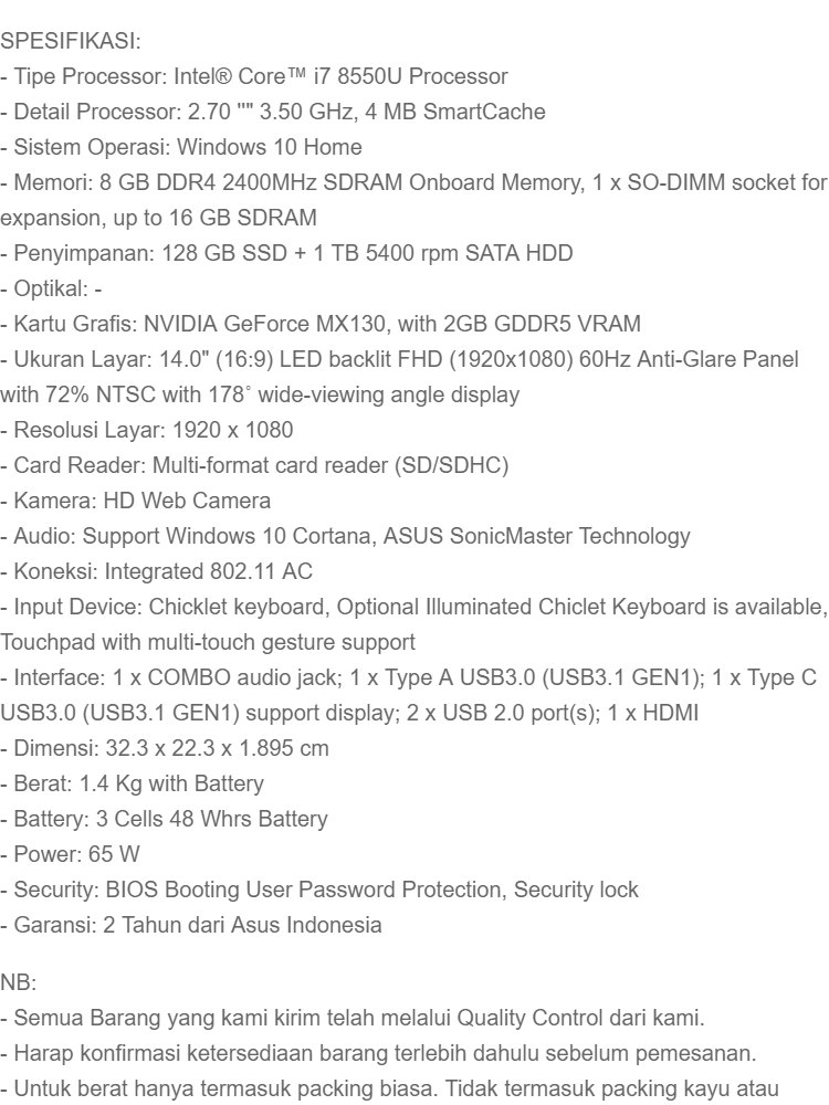 Asus Zenbook UX410UF - i7-8550U - 8GB - 1TB - 128GB SSD - MX130 2GB - 14 inch IPS FHD - Win 10