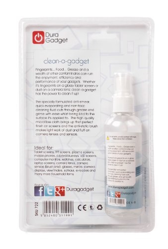 Product DescriptionDURAGADGET's new multi-purpose LCD cleaning kit is the answer to all your laptop screen cleaning needs. This kit includes an 100ml bottle of safe, non-toxic anti-static LCD screen cleaning liquid. Used in conjunction with the high quality microfibre, anti-scratch cleaning cloth, this non-damaging and non-flammable fluid will not damage the surface coating of your screen, simply leaving it clean and streak free.