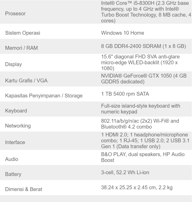 HP Pavilion 15-BC403TX - Intel Core i5-8300H - RAM 8GB - 1TB - Nvidia GTX1050 4GB - 15.6" - Windows 10 - Black