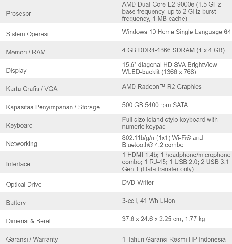 HP 15-DB0005AU - AMD E2-9200e - RAM 4GB - 500GB - 15.6" - Windows 10 - Black