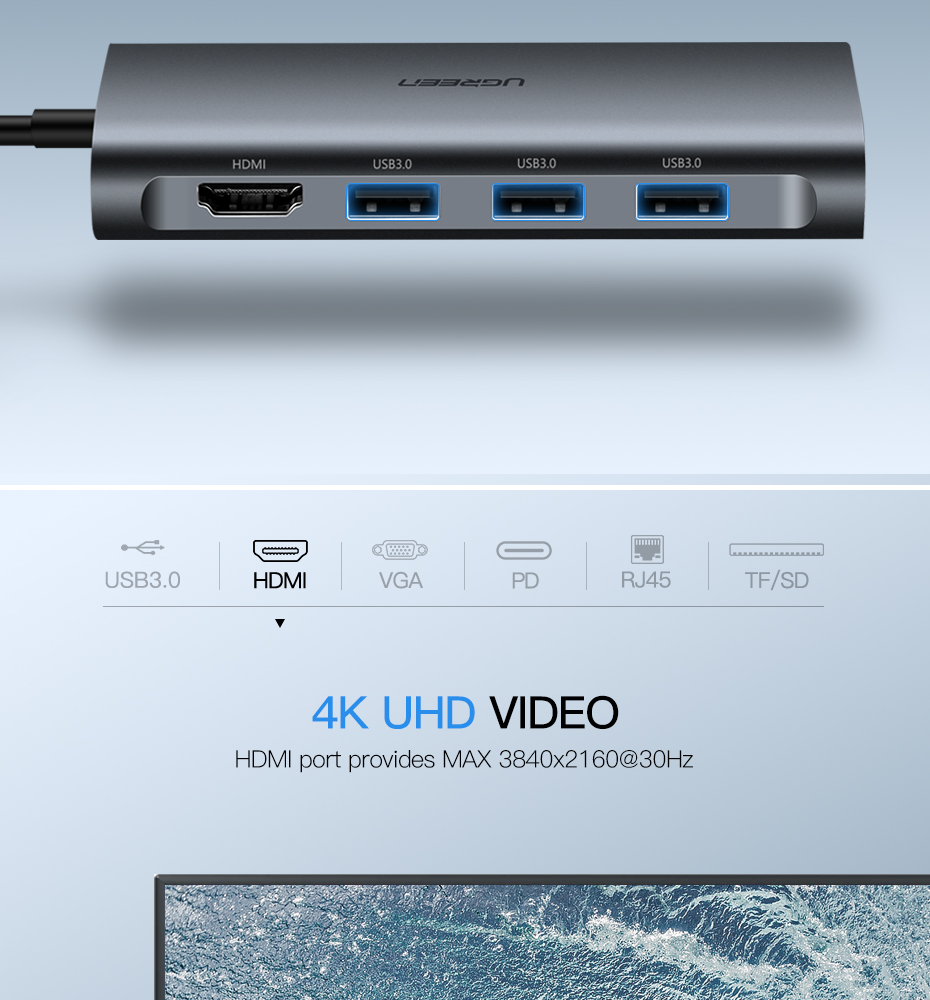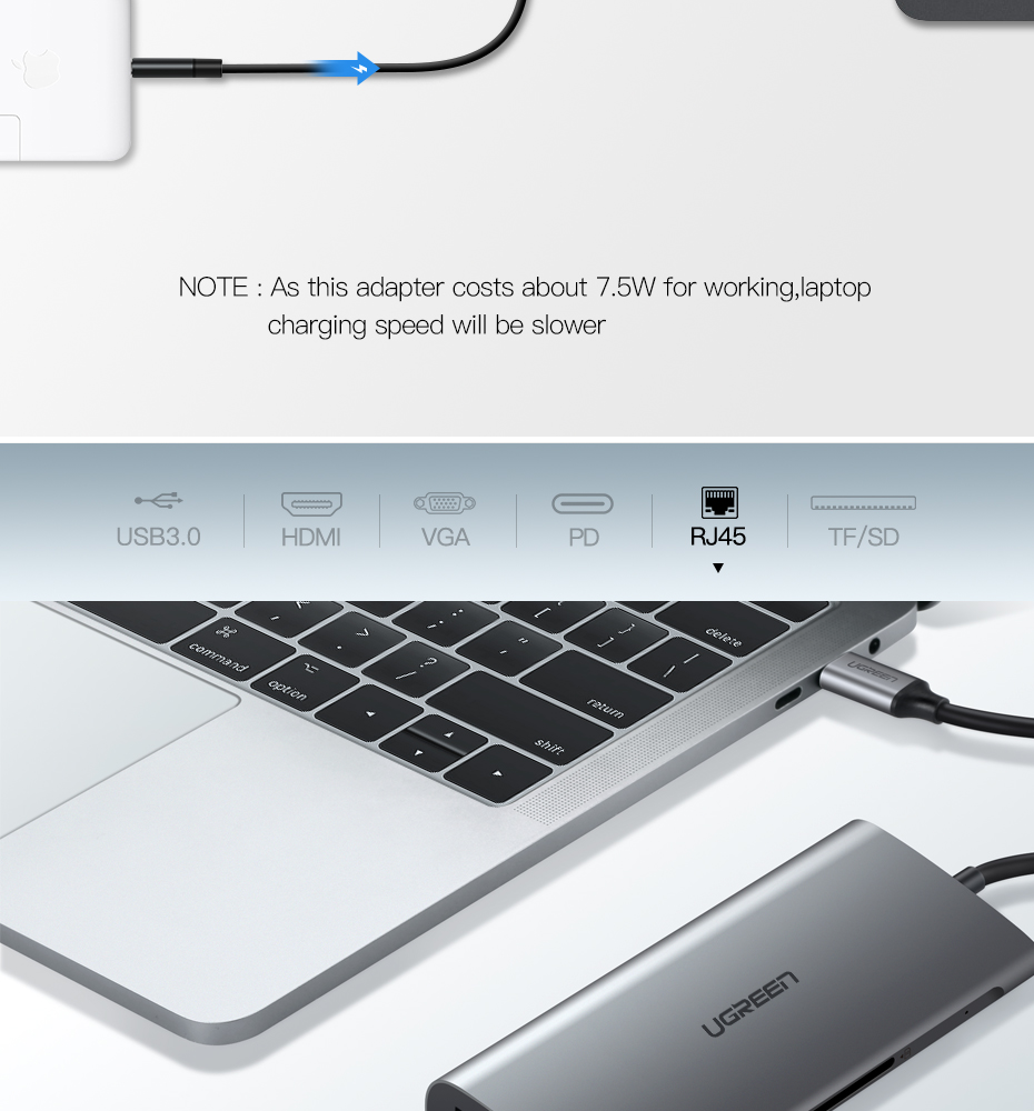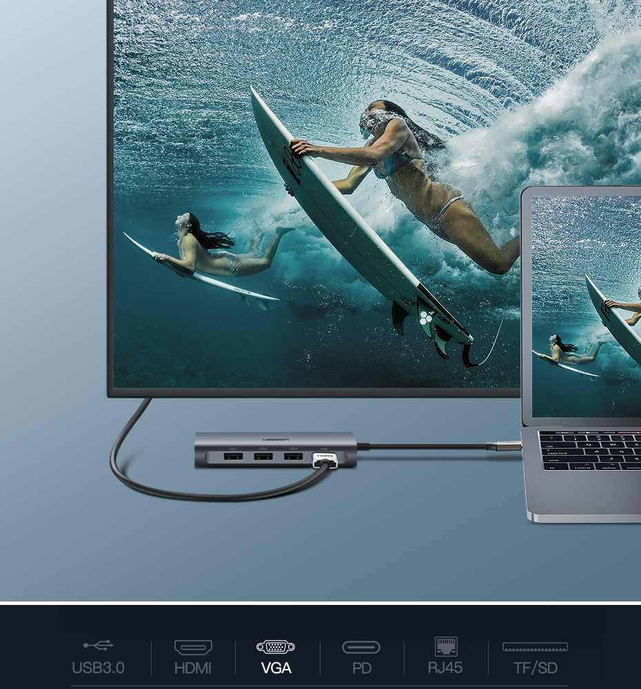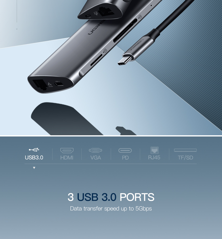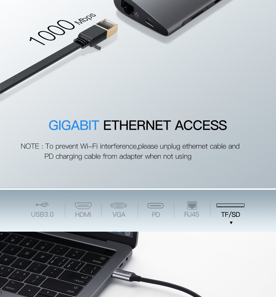 UGREEN Type C Hub 9 in 1 with HDMI VGA, PD Charge, Gigabit Ethernet Port, 3 USB 3.0 Ports, SD TF Card Reader USB C 3.1 Adapter Dock Station for Macbook Pro 2017 2016, Google chromebook, Dell XPS 13 15, Lenovo Yoga 900, HP Spectre notebook, Dark Grey