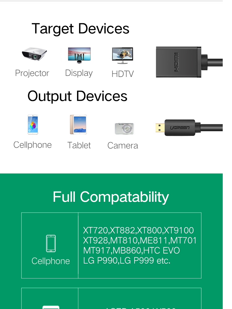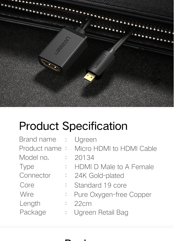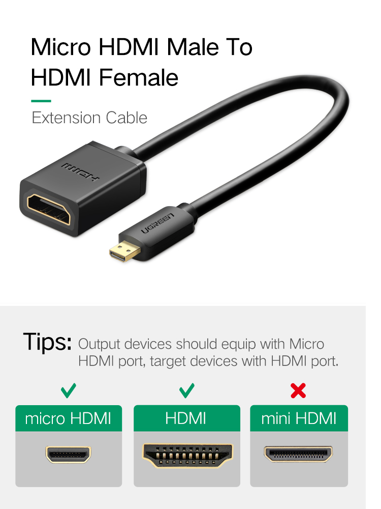 UGREEN 0.22M Micro HDMI to HDMI Cable Male to Female Micro HDMI Adapter Support 4K 60Hz 3D 1080P Ethernet Audio Return for GoPro Hero 6 Hero 5 Black, Nexus 10 Tablet, ASUS Zenbook Laptop, Camera