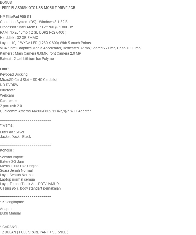 ![HP ElitePad 900G [LAPTOP 2 IN 1] INTEL ATOM Z2760 Windows 8 Ori 32 GB EMMC RAM 2GB LAYAR 10,1 INC TOUCHSCREEN](https://id-live-01.slatic.net/original/0bcd3319c6251368a6186abb0c6b282d.jpg)