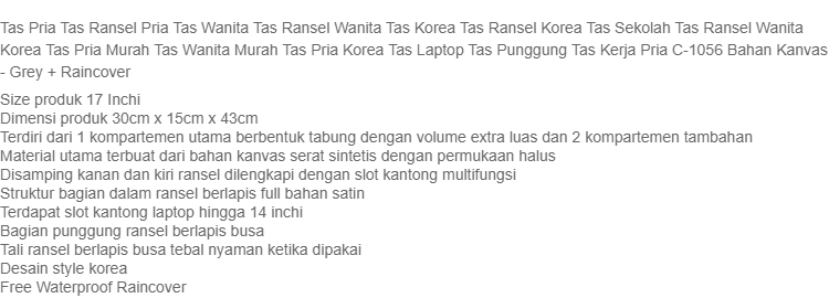 Tas Pria Tas Ransel Pria Tas Wanita Tas Ransel Wanita Tas Korea Tas Ransel Korea Tas Sekolah Tas Ransel Wanita Korea Tas Pria Murah Tas Wanita Murah Tas Pria Korea Tas Laptop Tas Punggung Tas Kerja Pria C-1056 Bahan Kanvas - Grey + Raincover