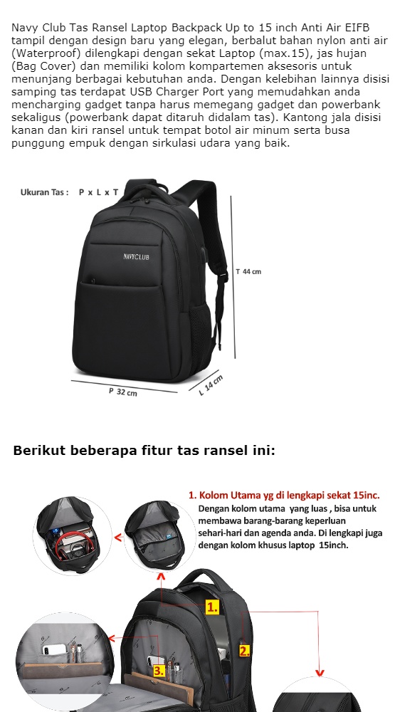 Navy Club Tas Ransel Laptop Tahan Air - Tas Pria Tas Wanita Tas Punggung - EHEJ Backpack Up to 15 inch - Hitam
